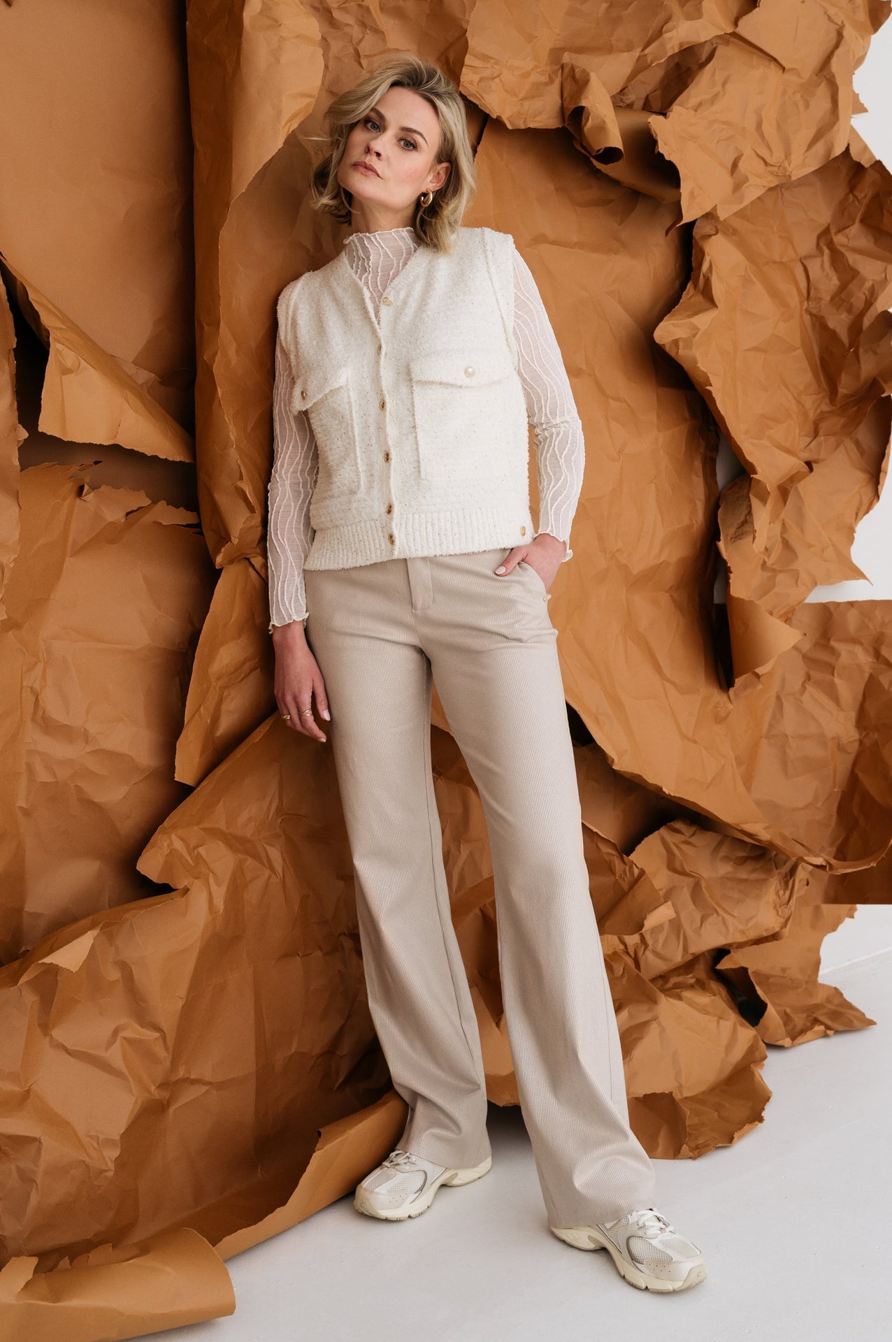 Deze leuke broek genaamd Brando heeft de kleur sand met gouden strepen. Leuk detail!