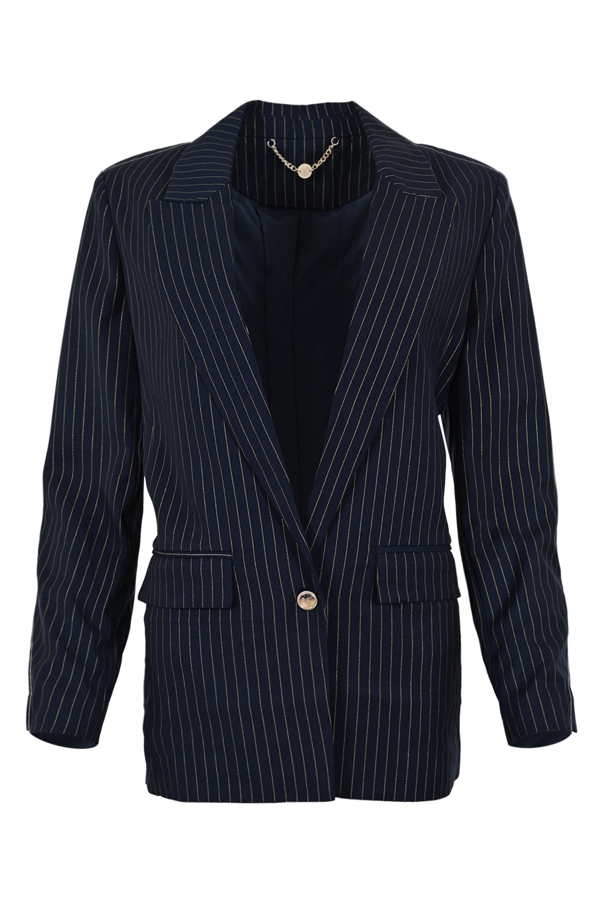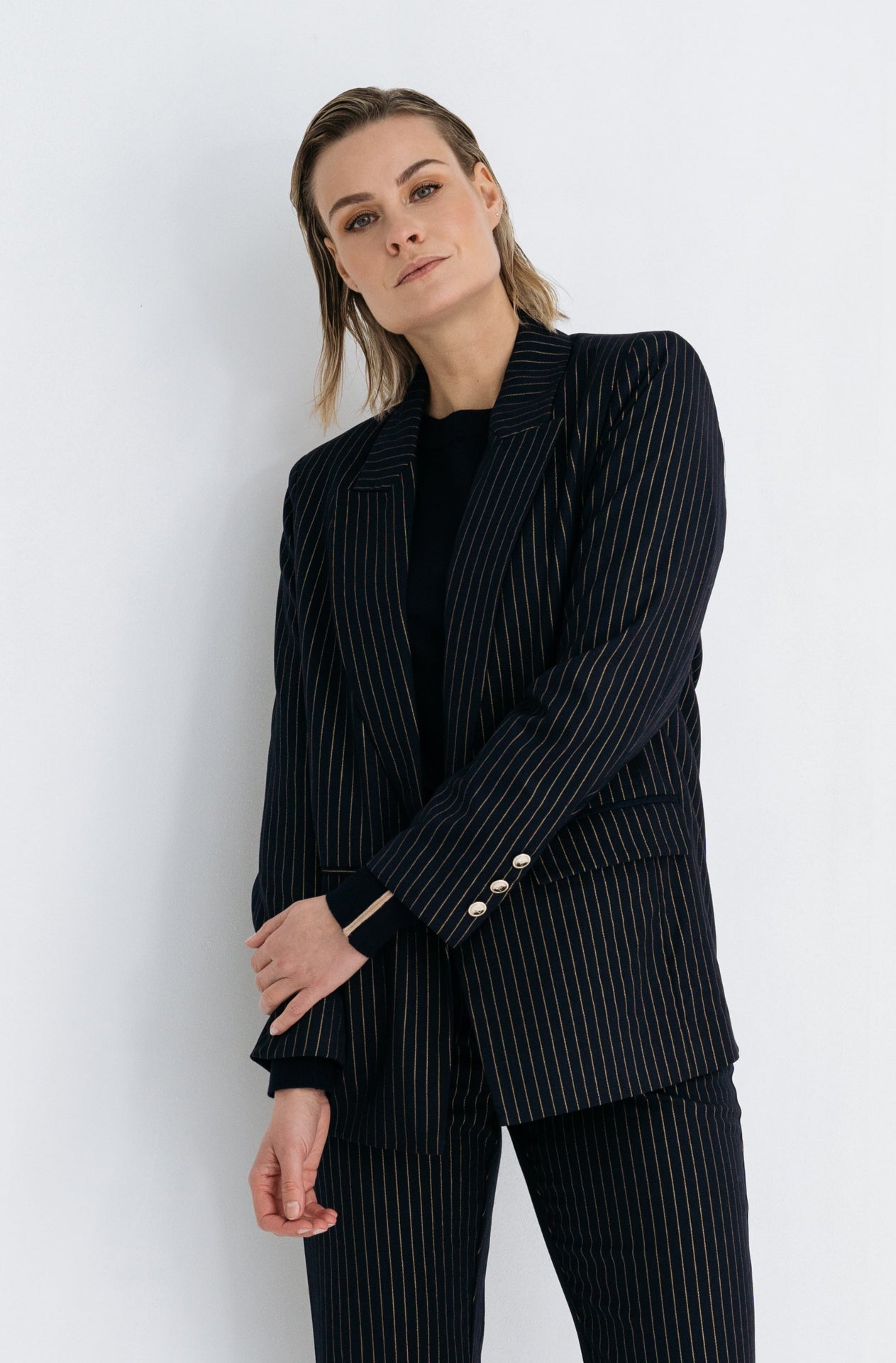 Phris, een blazer in pinstripe navy gold of in het zwart, biedt een perfecte balans tussen klassieke stijl en moderne flair. De strakke lijnen van de pinstripe geven de blazer een elegante uitstraling, terwijl de subtiele gouden accenten een luxe touch toevoegen. De zwarte variant straalt tijdloze verfijning uit, ideaal voor zowel zakelijke als chique gelegenheden. Het ontwerp biedt een slanke pasvorm en is ideaal te combineren met zowel formele als meer casual outfits voor een veelzijdige en moderne look.