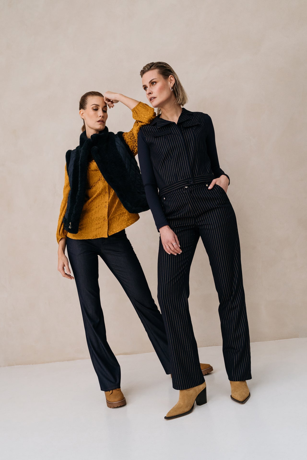 Dit mouwloze, nette vest in een verfijnde pinstripe print voegt een chique en professionele uitstraling toe aan je garderobe. De light gold buttons en de elegante kraag geven het vest een luxe afwerking, terwijl de twee borstzakjes een praktisch detail bieden zonder afbreuk te doen aan de stijl. Dit vest is ideaal om over een blouse of een top te dragen voor een gelaagde, stijlvolle look. De pinstripe print geeft het item een tijdloze, klassieke flair, perfect voor zowel zakelijke als meer casual outfits.